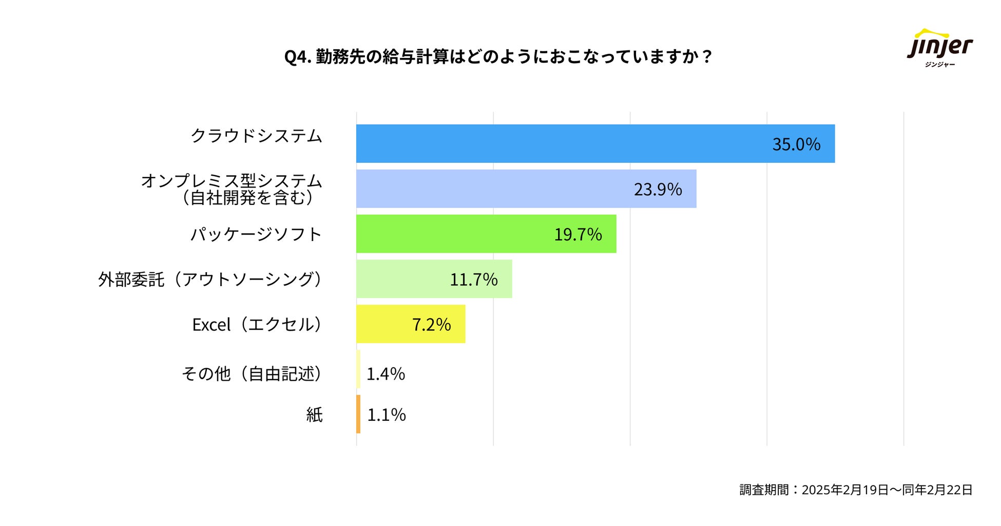 「106万円の壁」に該当するかを確認する上で、重要な業務の一つである「給与計算の方法」について質問したところ、最も多かった回答は「クラウドシステム(35%)」でした。
