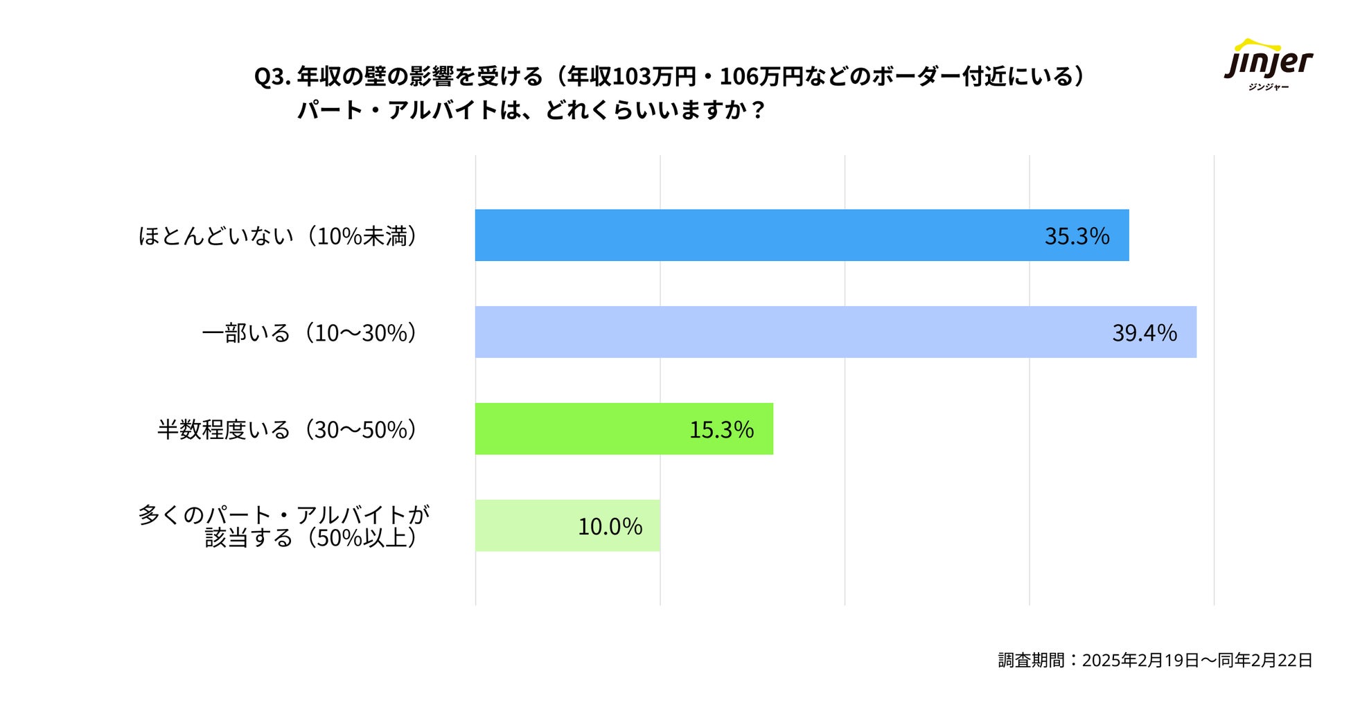 「106万円の壁」の影響を受ける可能性があるパート・アルバイトが、どれ程度いるかについて質問したところ、「一部いる(39.4%)」、「半数程度いる(15.3%)」、「多くのパート・アルバイトが該当する(10%)」を合わせて約64.7%に上ることがわかりました