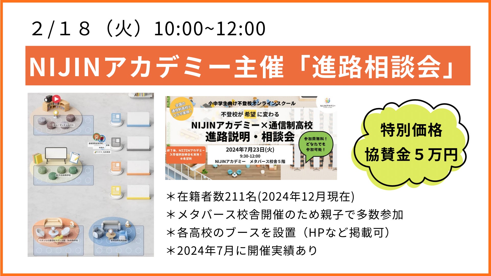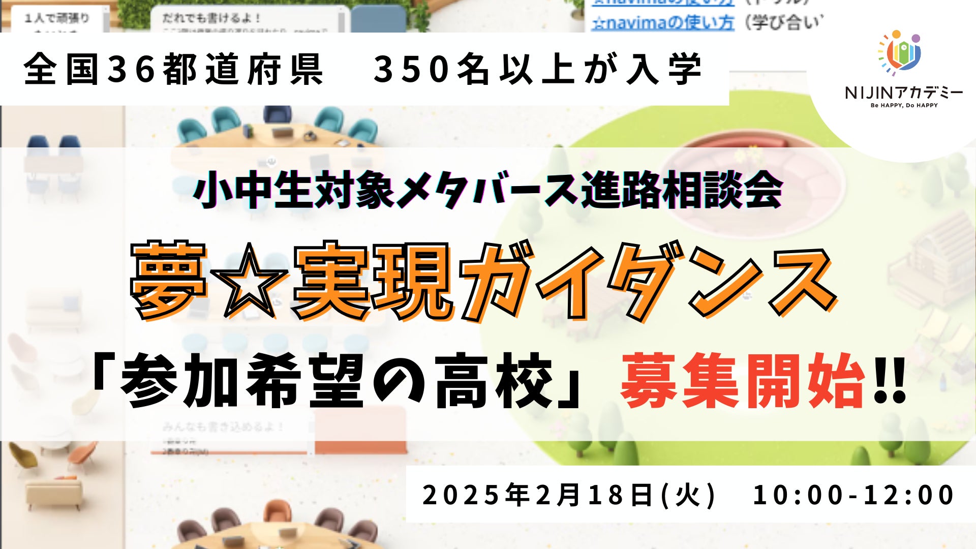 株式会社NIJIN(本社:東京都江東区、代表取締役:星野達郎)が運営する不登校オルタナティブスクール『NIJINアカデミー』主催のメタバース進路相談会に参加する高校の募集を開始したことをお知らせします。