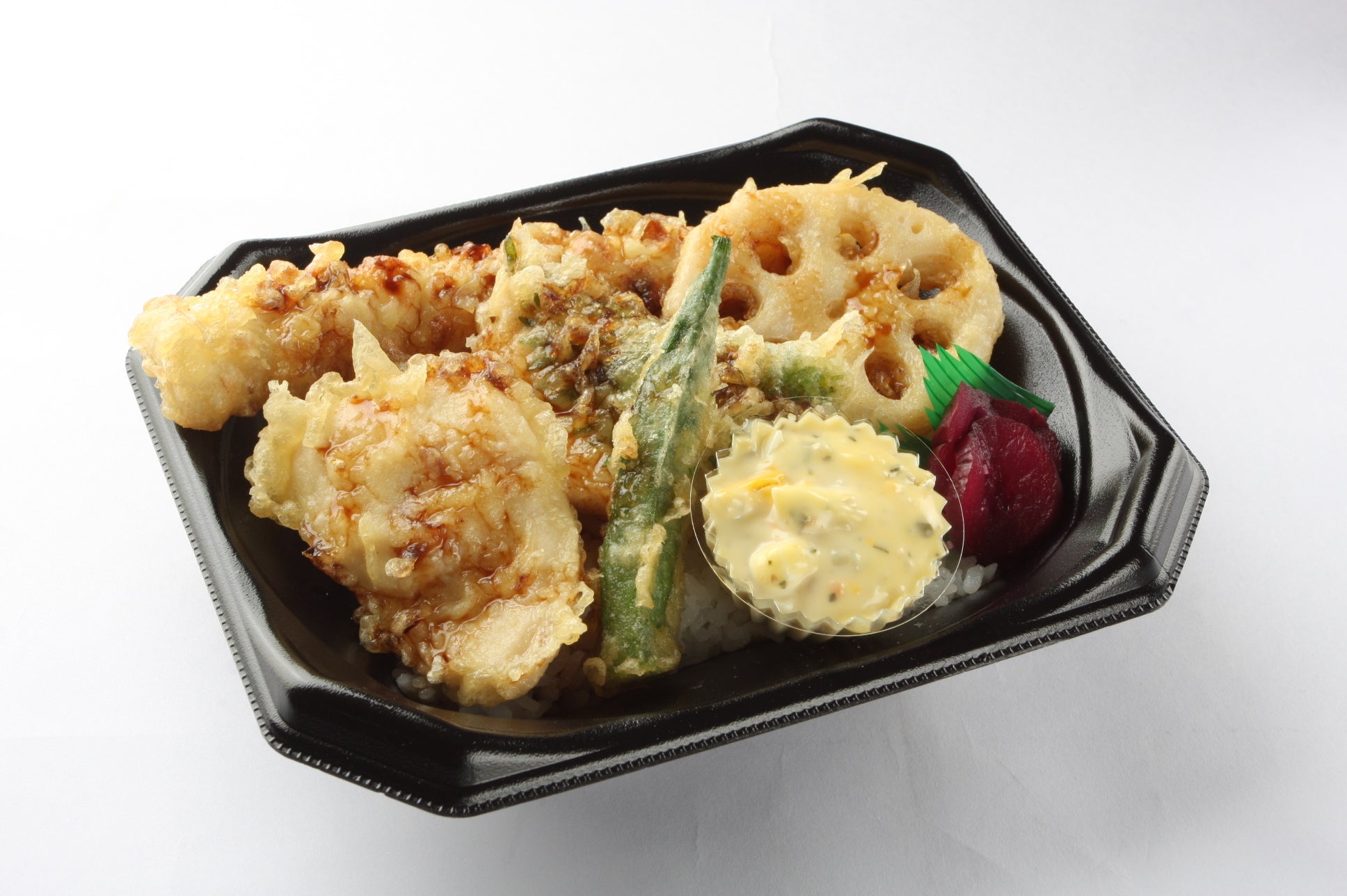 ジューシー鶏天やちくわハーフ天を盛り込んだ天丼。自家製の玉子たっぷりタルタルソースと特製天丼たれをお好みでかけてお楽しみいただけます。