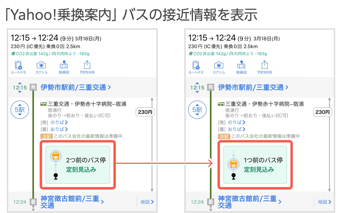 ユーザーが検索したルート上に三重交通の路線バスがある場合、ルート検索結果画面の詳細を開くと「2つ前のバス停」や「1つ前のバス停」と接近情報を表示します。