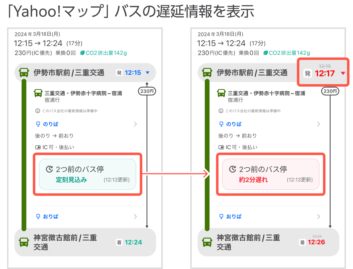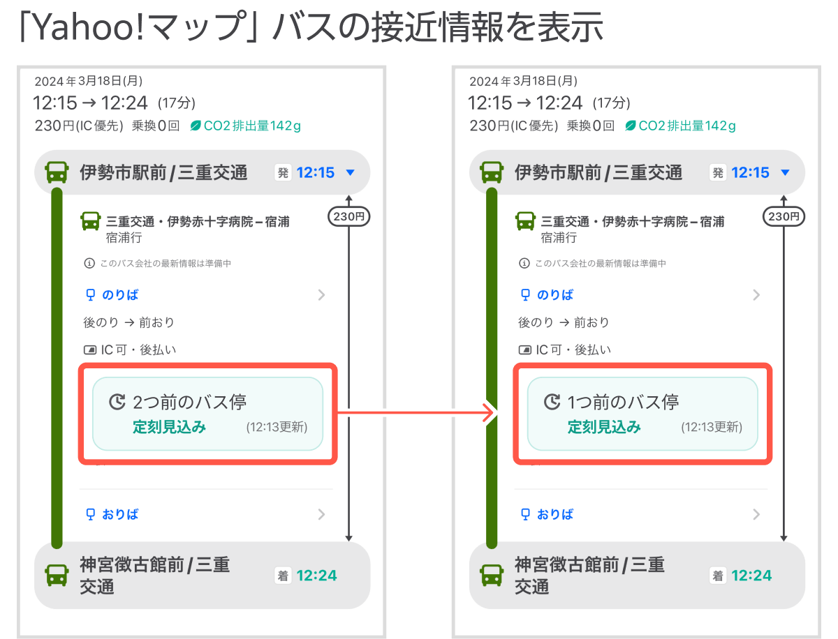 本機能は、三重交通がJR東日本のプラットフォーム(※2)を活用し、「Yahoo!乗換案内」と「Yahoo!マップ」へリアルタイムデータの提供開始したことで、路線バスのリアルタイムな情報の表示が可能になりました。