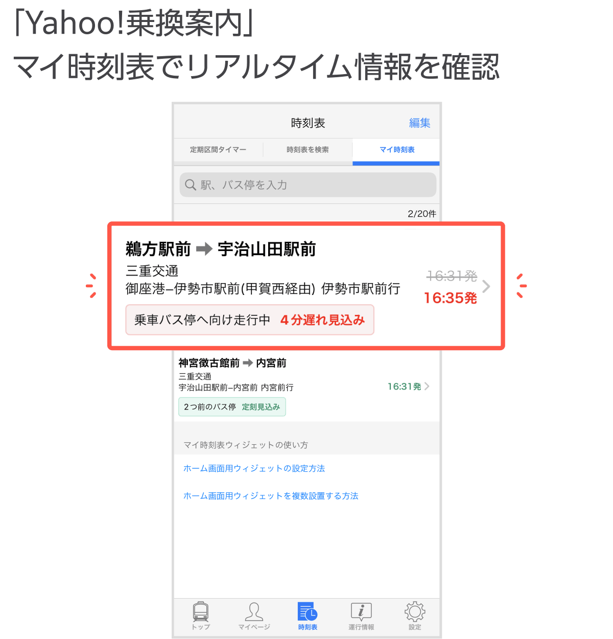 通勤や通学など頻繁に利用するバス停の時刻表も「マイ時刻表」(※10)へ登録しておくことで、リアルタイム情報を確認できます。