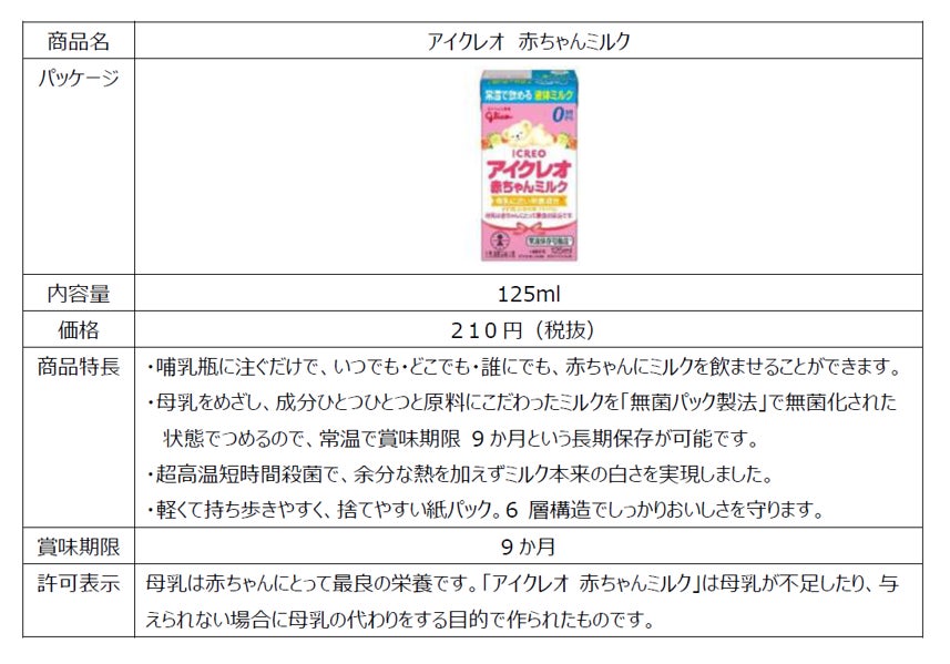 江崎グリコは、当社の存在意義(パーパス)「すこやかな毎日、ゆたかな人生」の実現に向け、「発育・栄養の最適化」を注力領域の一つとしています。その中核を担うのが乳幼児用ミルクブランド「アイクレオ」です。アイクレオは、母乳に近いミルクをめざす小児科医の想いを原点に、品質や原料にこだわり、乳幼児期のお子様の発育と家族の成長をサポートしてきました。2019年3月には、乳児用調製液状乳(以下、乳児用液体ミルク)について消費者庁より特別用途食品の表示許可を受け、日本初の乳児用液体ミルクとして「アイクレオ 赤ちゃんミルク」を発売しています。