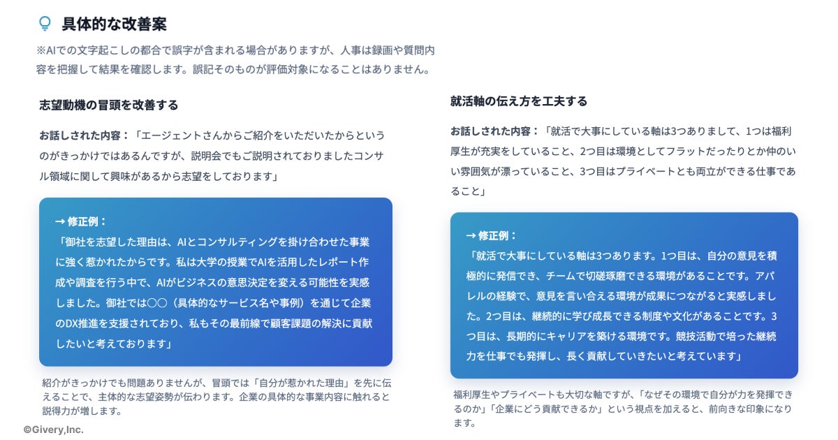 • 改善点: 言葉遣い、回答の冗長性(結論ファースト)、深掘り対策など、具体的な改善ポイントを指摘します。