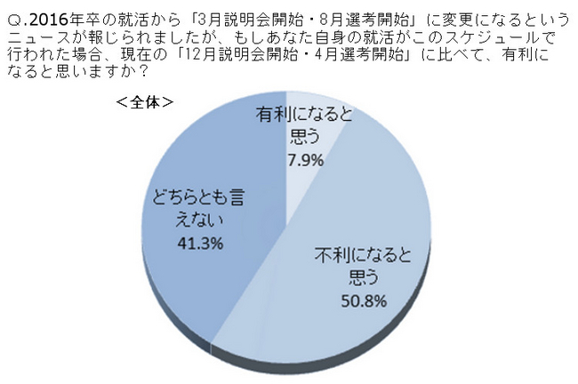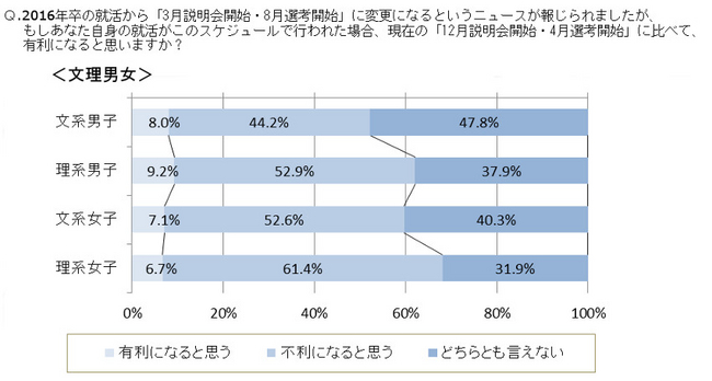 最近ニュースなどで取り上げられた2016年卒の就職活動のスケジュールの変更について聞いてみると、現在の就職活動に比べて「有利になると思う」が7.9%だったのに対して、「不利になると思う」が50.8%と過半数を占める結果となった。有利になると思う理由としては、『就活準備をする時間が増えるから』(文系男子)、『理系の場合、就職活動時期が遅い方が学会等に参加しやすくなり、実績を残せるから』(理系女子)などが挙がった。一方、不利になると思う理由としては、『選考が遅くなれば、大企業に落ちたあと、中小企業へ行く時間が少なくなる』(文系男子)、『卒業研究の追い込みの時期と重なるので、準備が間に合わないから』(理系男子)などの理由が挙がった。
