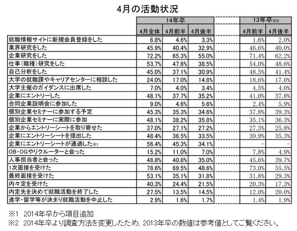 「2014年卒マイナビ学生就職モニター調査 4月の活動状況」を発表