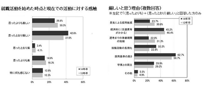 内定を取る自信について聞いてみると、自信は「(大いに+少し)ある」が前年同月比4.6pt増の57.3%となった。「大いにある」は前月比13.1pt増と大幅に増加し、特に理系男子では「大いにある」が44.6%と高い割合となった。実際に内々定を受けた学生はもちろん、未内定学生でも、選考の進捗を経て自信を深めているようだ。就職活動を始めた時点と比べた現在の活動に対しては、「(思ったよりも:26.6%+思ったとおり:42.6%)厳しい」が前年同月比1.9pt増の69.2%となった。厳しいと思った理由としては、「採用基準の高さ」が前年同月比6.0pt増の62.7%と最も割合が高く、自信はあっても現実には厳しさを感じているようだ。