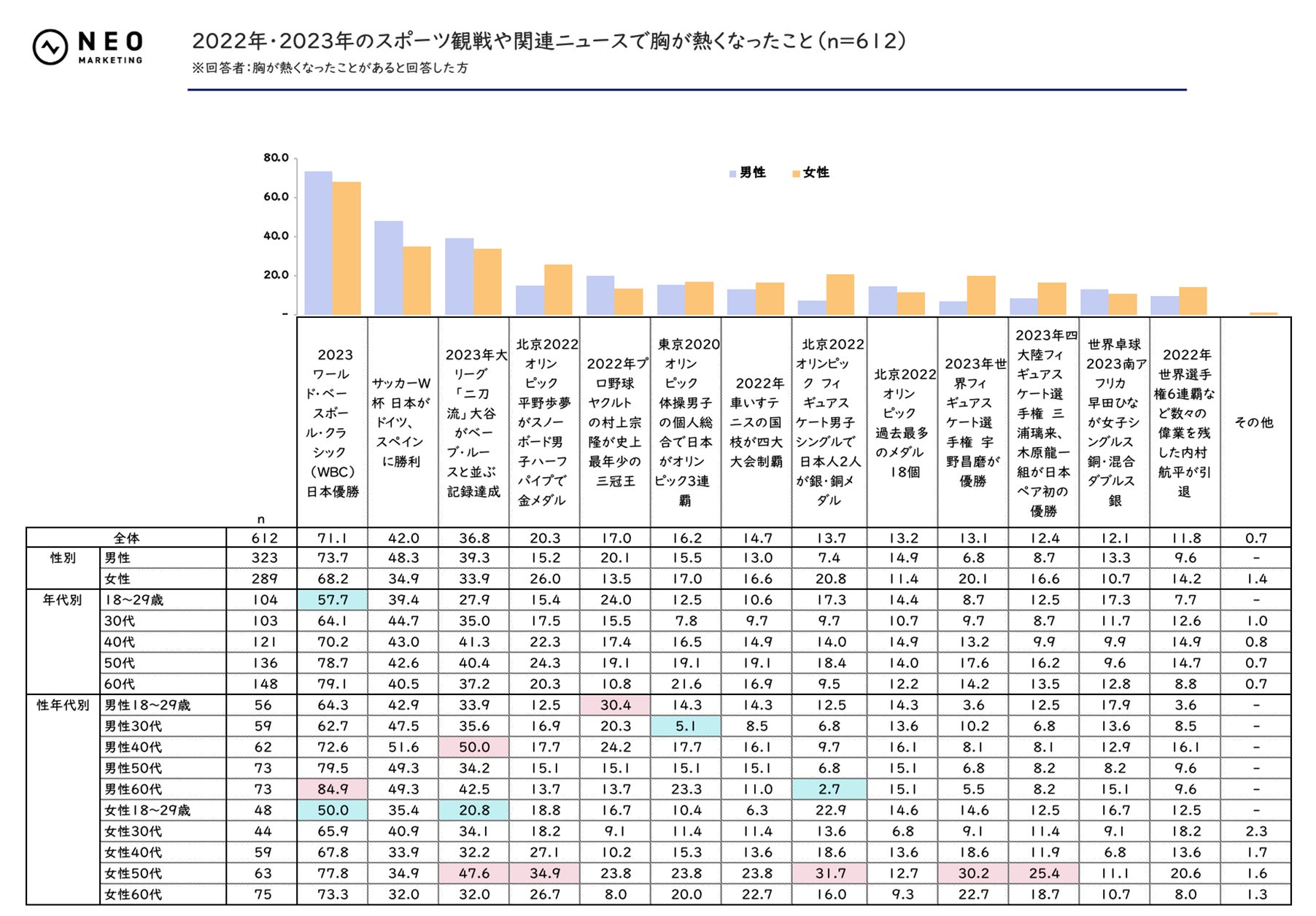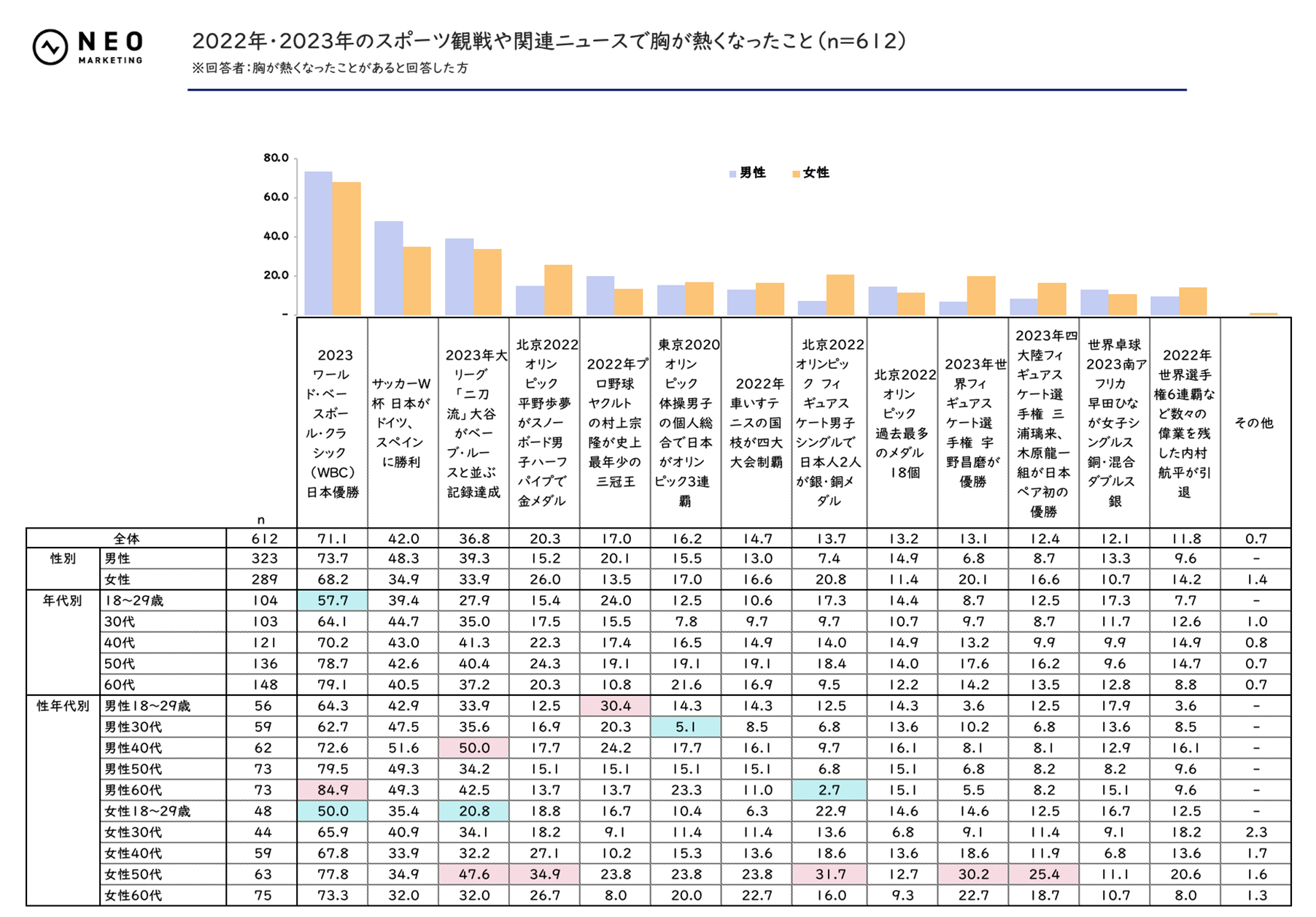 2022年・2023年のスポーツ観戦や関連ニュースで胸が熱くなったこと(n=612)