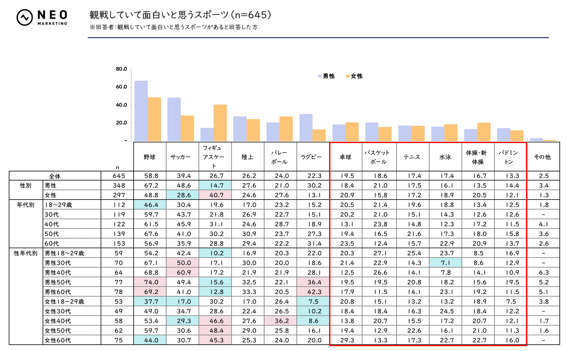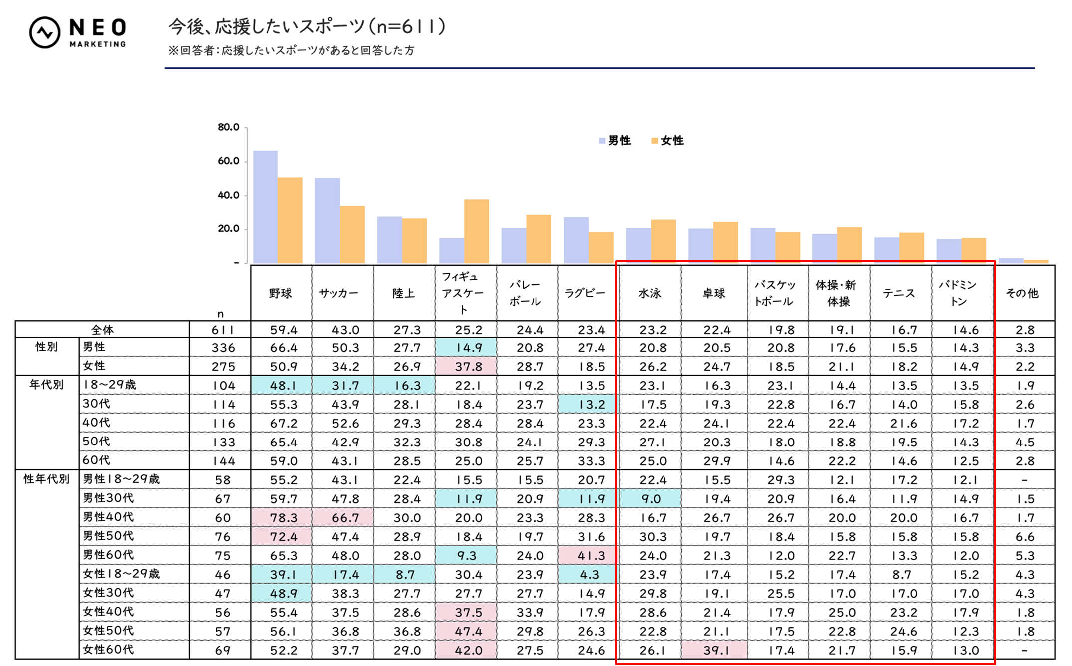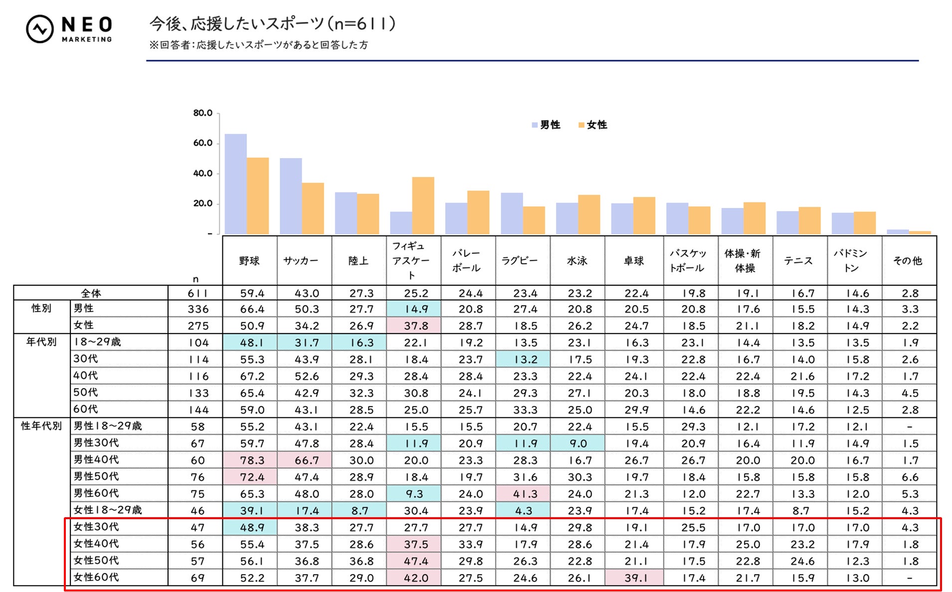 全体の結果を見ると、トップが野球で58.0%、そこにサッカー、陸上、フィギュアスケートが続いており、前掲した設問「今後、応援したいスポーツ」の傾向と概ねリンクしていることがわかります。