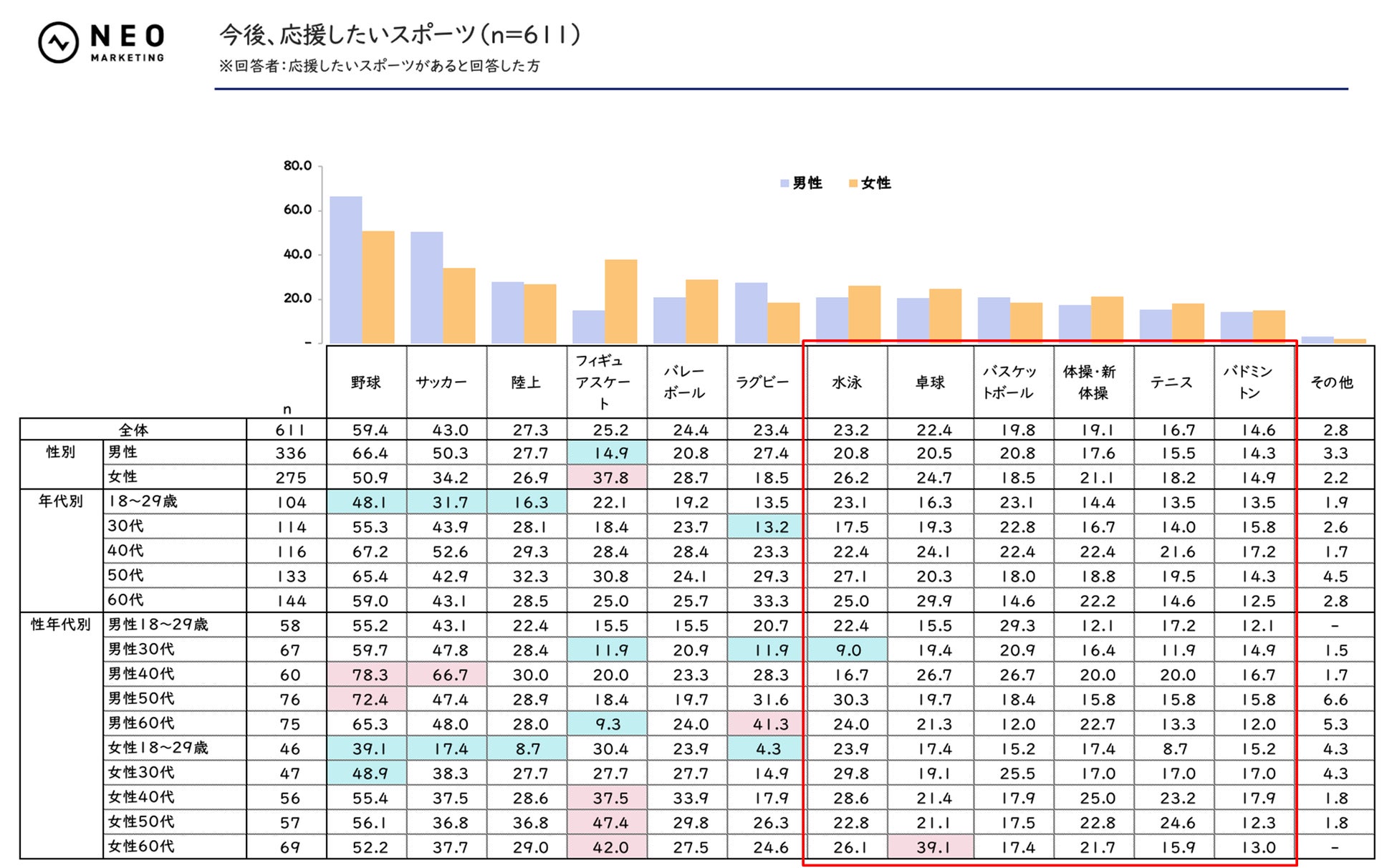 TOP4を男女で比較してみても、男性の場合は野球・サッカー・卓球・陸上、女性の場合はテニス・バレーボール・バスケットボール・水泳と、バラバラであることがわかります。