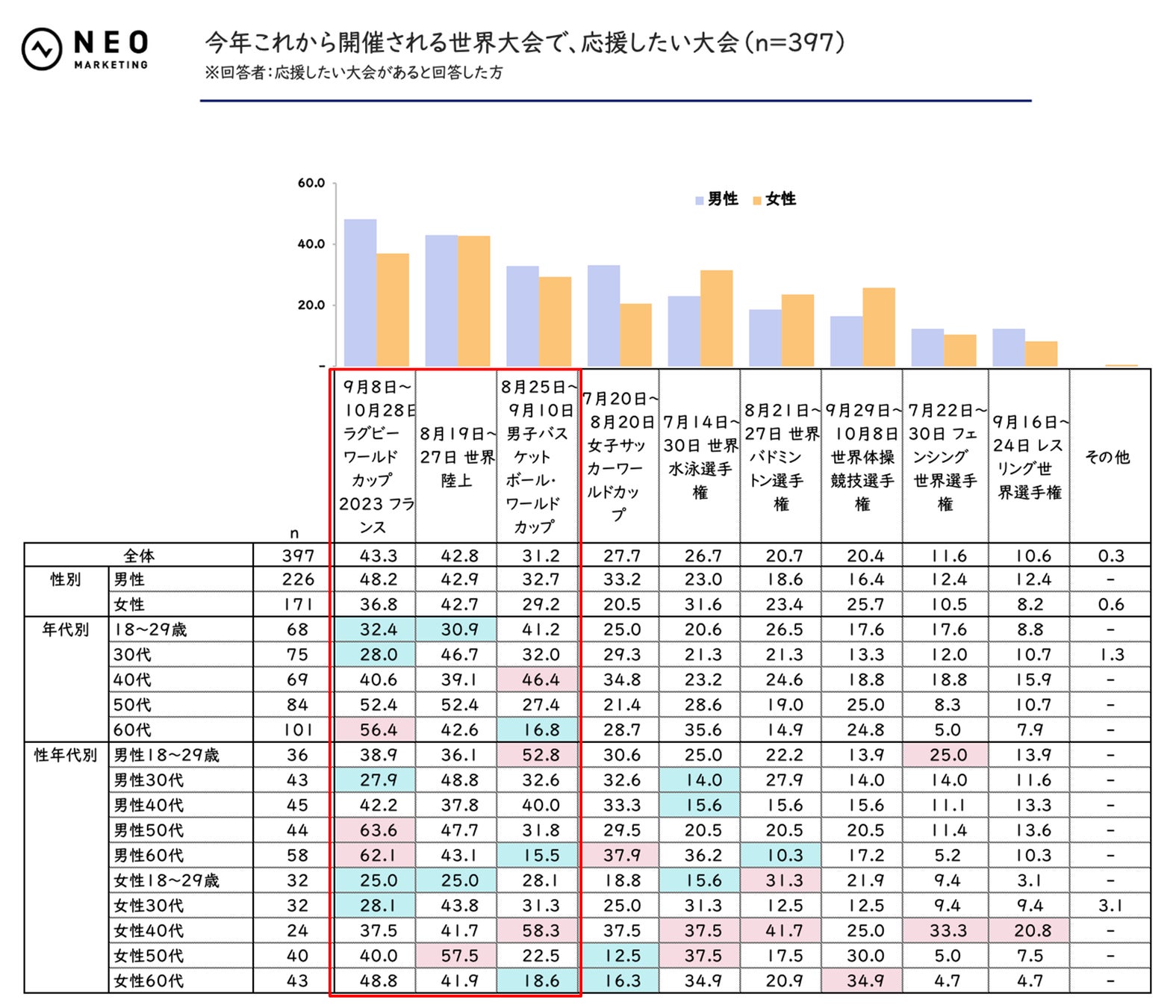 特にラグビーワールドカップは、応援したい大会があると回答した男性の48.2%が注目。男性の中でも50代・60代から特に熱い支持を受けているよう。