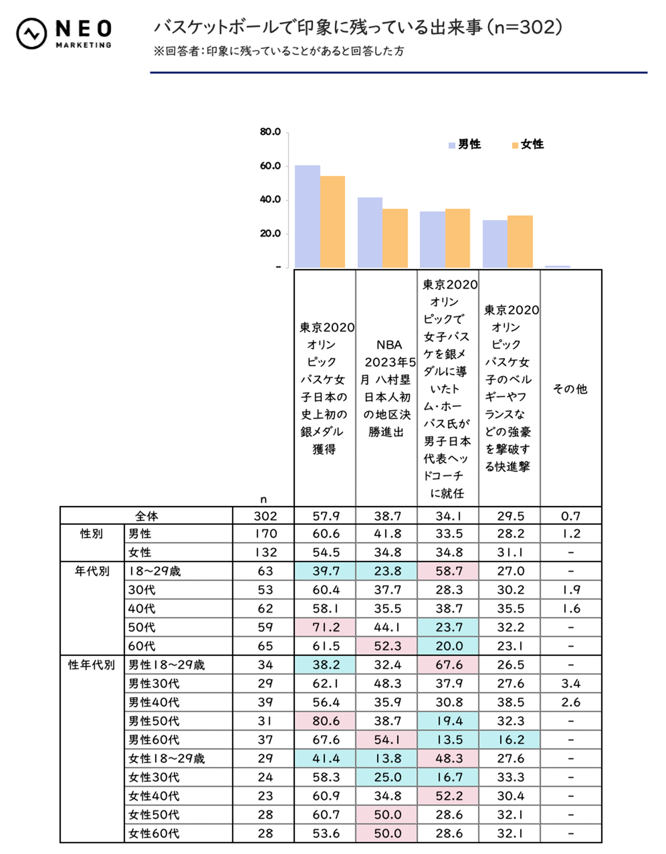 次にバスケットボールに関連する、印象に残っている出来事についてお聞きしました。(以下のグラフは印象に残っていることがあると回答した方の回答をもとに作成)