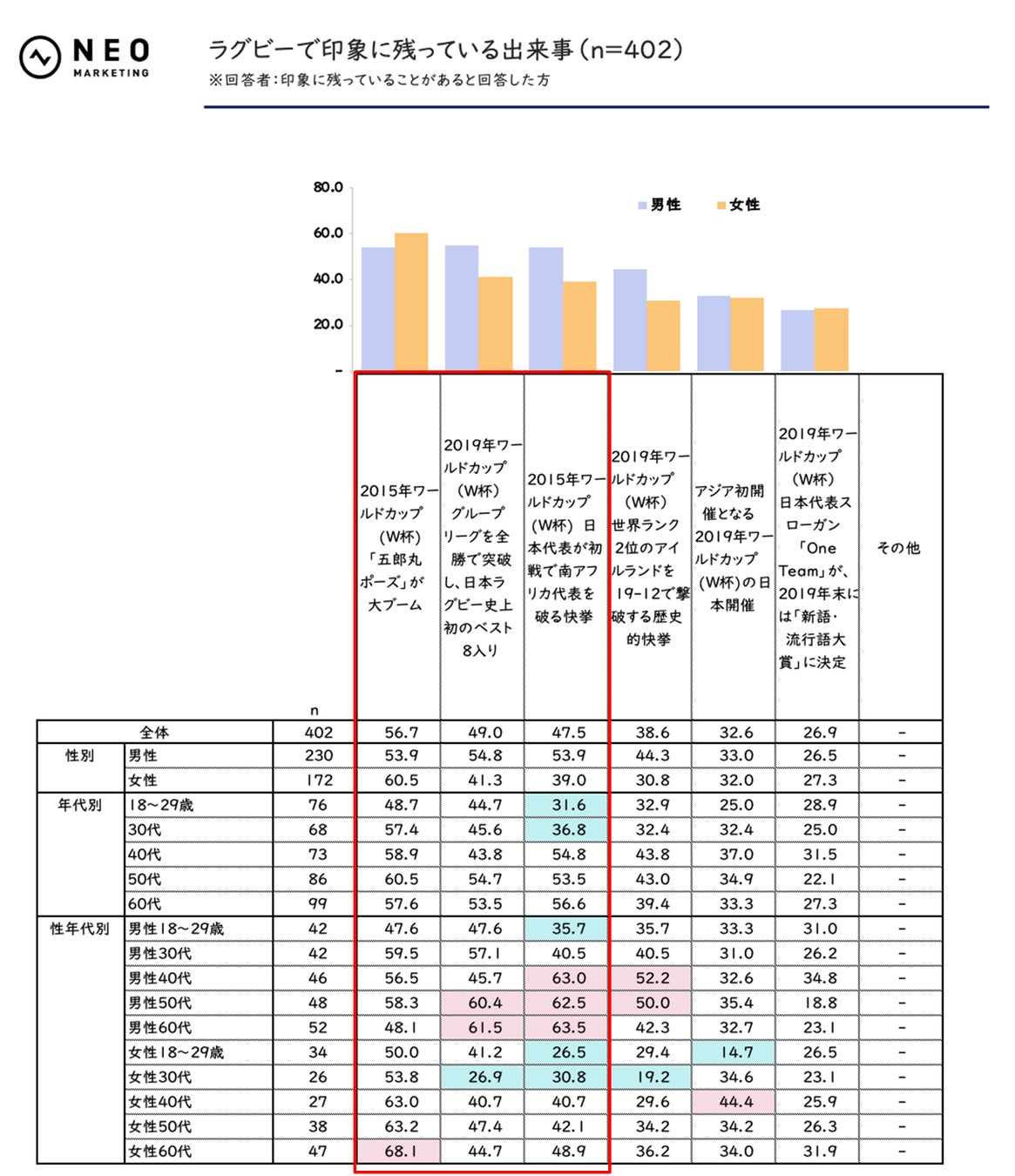 全体の回答を見ると、20%を切った項目が1つも無く、ひとつひとつの出来事のインパクトの大きさがうかがえます。2015年・2019年と、8〜4年前の出来事でありながら「五郎丸ポーズ」や「ベスト8」「One Team」といったキャッチーなキーワードとともに、今でも当時の試合を鮮明に覚えている人が多いのではないでしょうか。