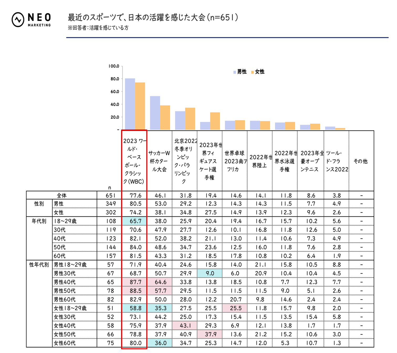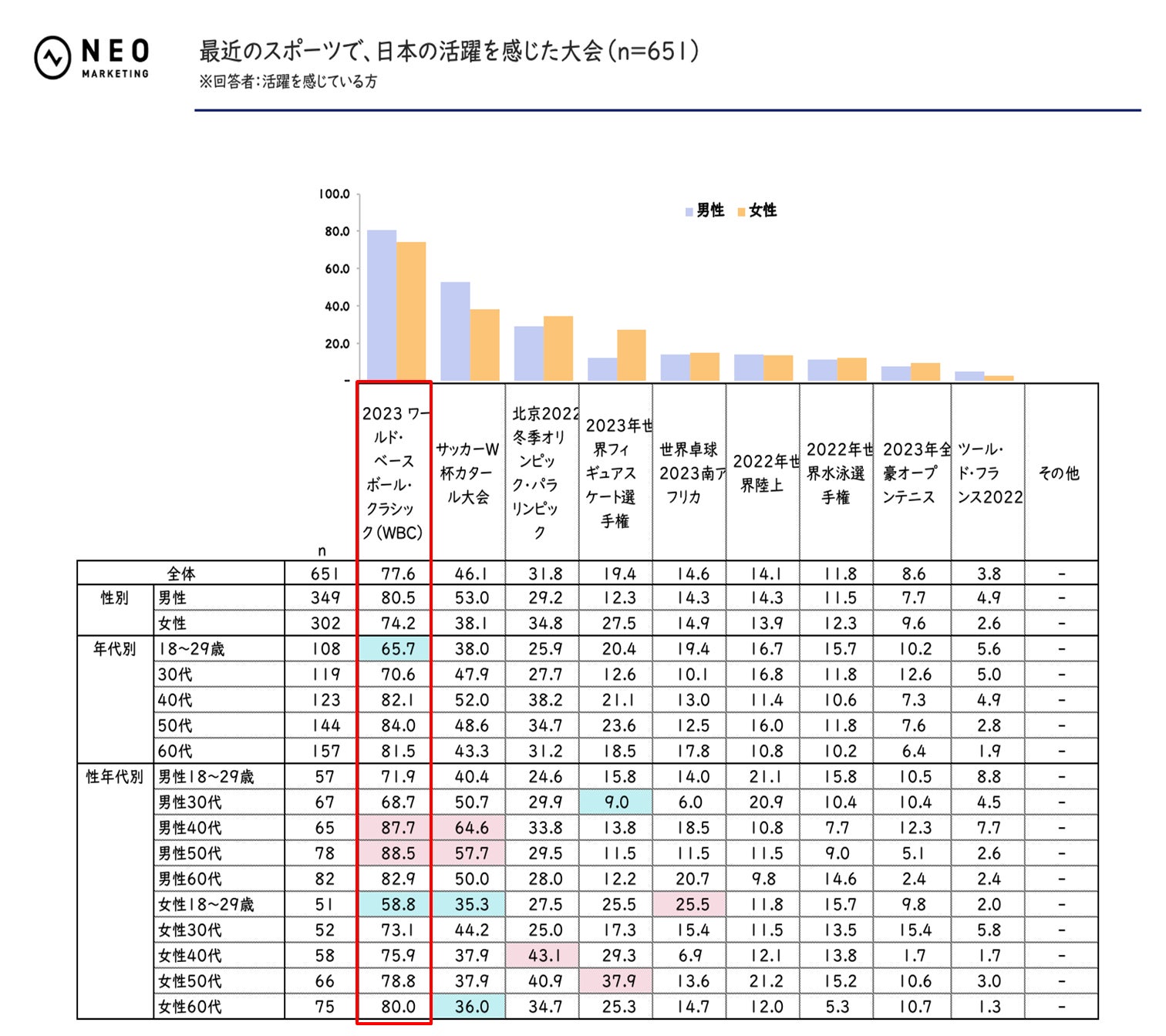 全体の結果では「2023 ワールド・ベースボール・クラシック(WBC)」(以下、WBC)が77.6%でトップとなりました。次点の「サッカーW杯カタール大会」と31.5ポイントもの差をつけてのトップです。他の大会については40%を超えることのなかった女性の票もWBCには74.2%集まっています。
