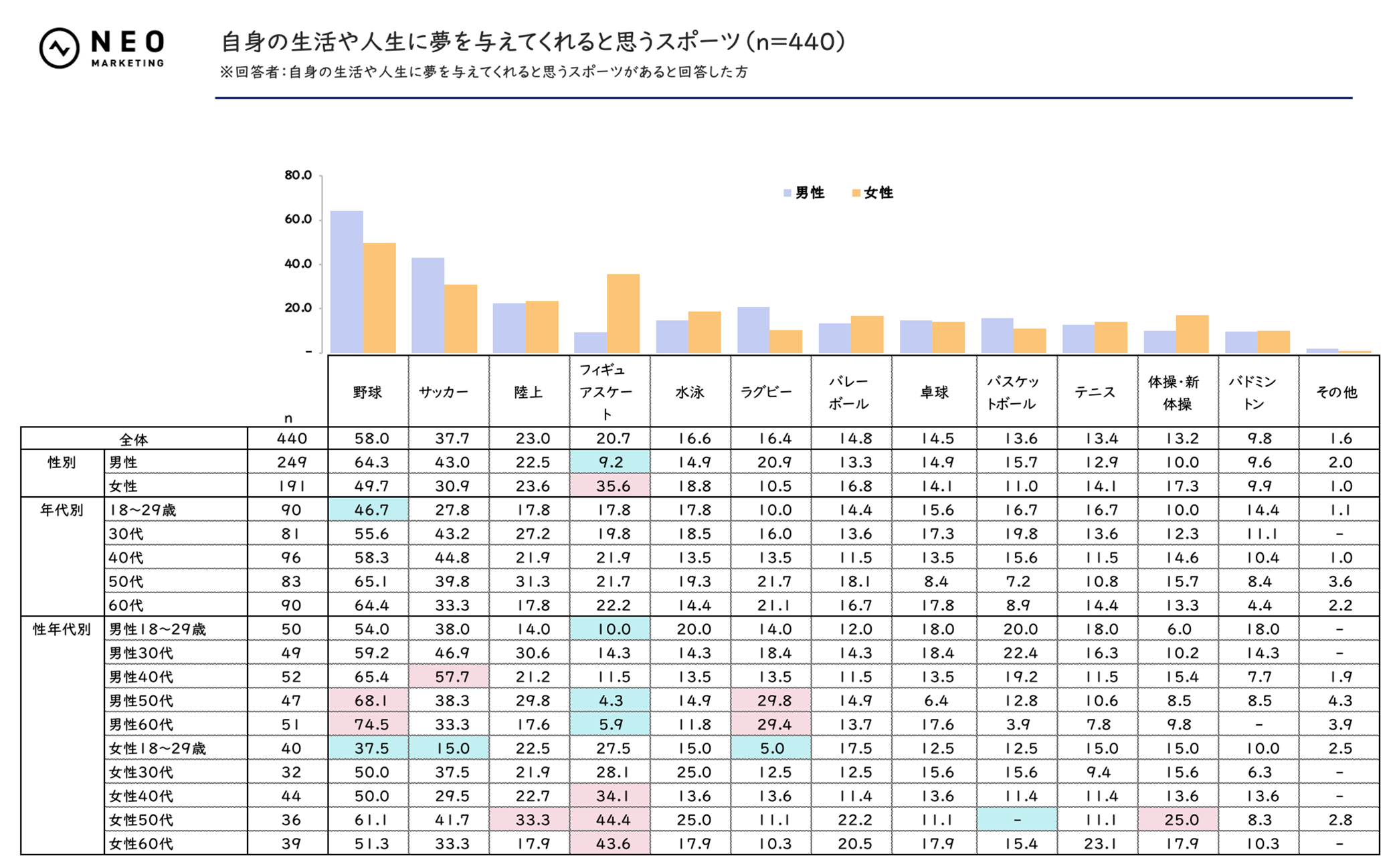 全体の結果では、野球が半数を大きく上回る59.4%でトップとなり、そこにサッカーが43.0%で続いています。40%を超えたのはこの2つのみで、それ以下の陸上やフィギュアスケート、バレーボールなどはいずれも20%台で推移しました。