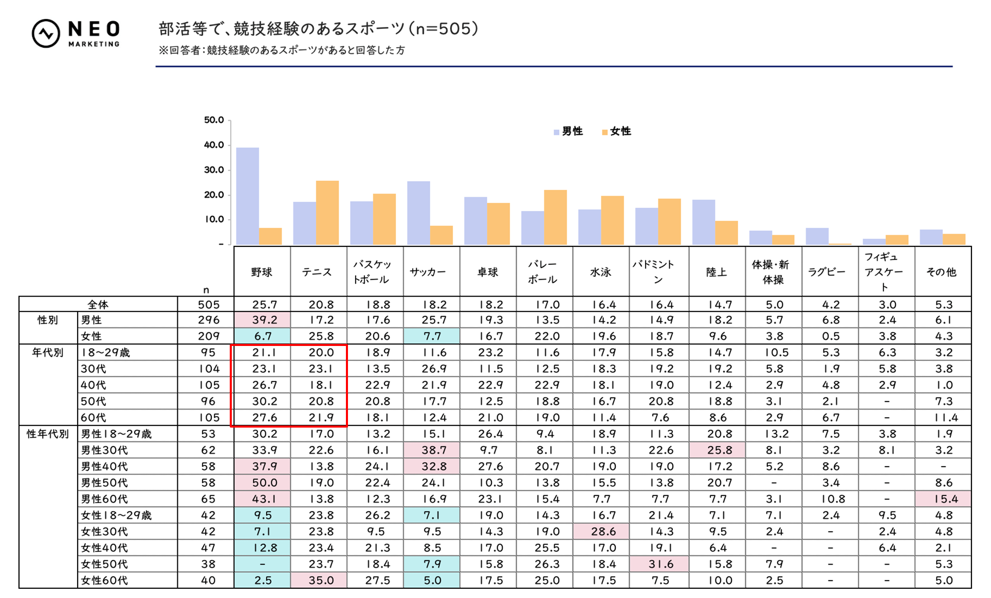 全体のトップが野球で25.7%、そこにテニスが20.8%で続きました。特にこの2競技は、ほとんどの年代において20%以上の競技経験があり、どの年代においても一定の競技知識があることがうかがえます。