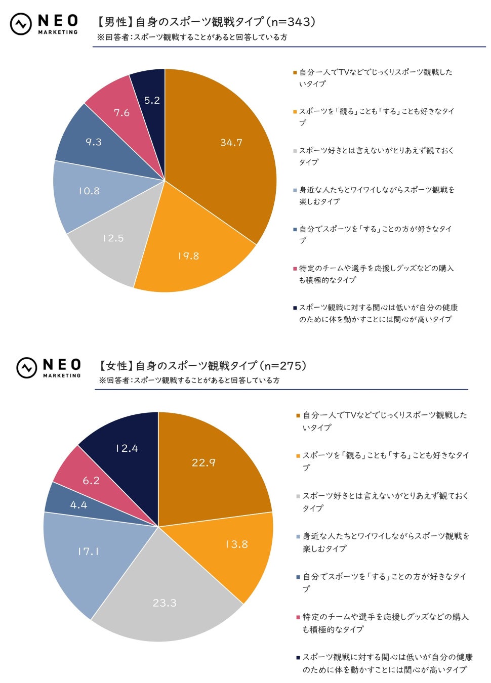 一方で、女性の場合は「スポーツ観戦に対する関心は低いが自分の健康のために体を動かすことには関心が高いタイプ」が男性の倍以上の12.4%だったり「身近な人たちとワイワイしながらスポーツ観戦を楽しむタイプ」が男性より6.3ポイント高い17.1%だったりと、スポーツ以外の目的(健康・美容・仲間との交流・イベントとしての楽しさ)をもってスポーツとかかわる人が比較的多いのが特徴的です。