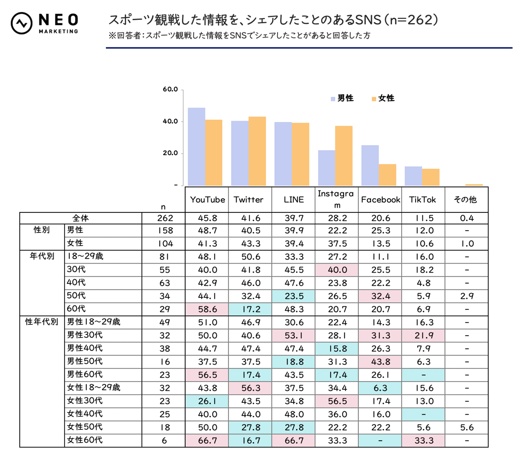 スポーツ観戦した情報を、シェアしたことのあるSNS(n=262)