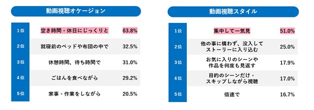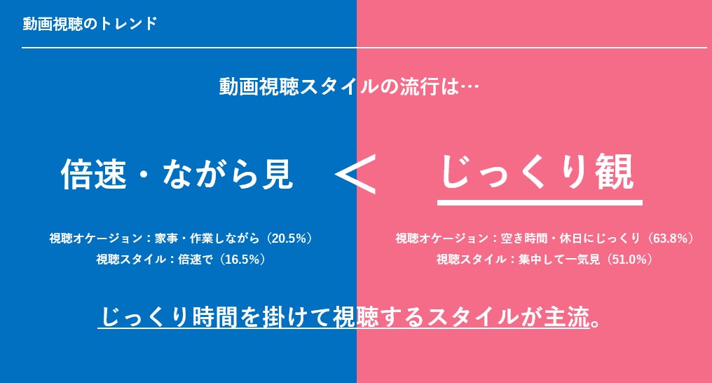 動画視聴スタイルは、全世代において「じっくり・集中して一気見」派が大半を占めています。視聴時間帯も21時~22時が多く、1日の終わりにじっくりと動画を見る人が多い傾向。タイパを意識した、“倍速視聴”や“ながら視聴”よりも、じっくり時間を掛けて視聴するスタイルが主流となっています。