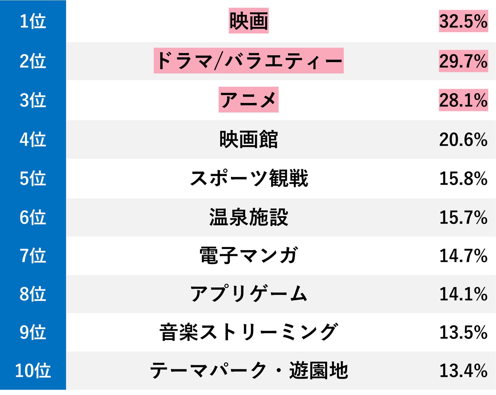 好きなエンタメコンテンツは映画・ドラマ・アニメの動画系コンテンツが上位を占め、エンタメユーザーを最も惹きつけるのは「動画」ということがわかりました。