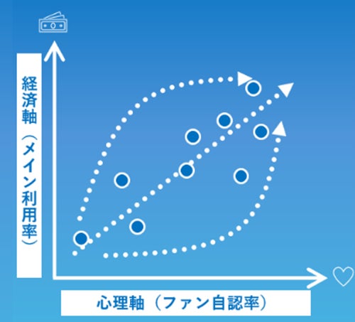 当社におけるマーケティング事業では、商品・サービス・ブランドを支持し、売上・収益をもたらしてくれるだけでなく、他者にも影響を与えうる発信行動により情報の起点にもなりうる存在を「ファン」と位置づけ、「心理軸」と「経済軸」で定義をしています。