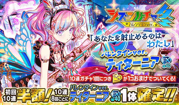 シーズンガチャ冬では、狙撃銃で敵を狙う「バレンタインver. ティターニア」が新登場!初回の10連が半額、さらに10連8回ごとに「バレンタインver. ティターニア」が1体確定!