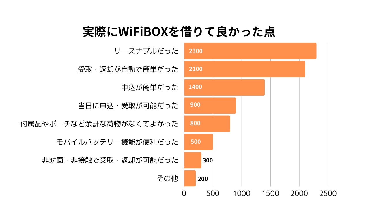 Wi-Fiレンタルサービスの中でも、WiFiBOXを利用しようと思ったきっかけとしてアンケートを取ったところ、最も票を集めた意見が「受取・返却が簡単そう」でした。そして実際に利用して良かった部分の2位としてランクインしたことから、概ね利用者の期待通りであったことがわかりました。またそれ以上に、リーズナブルな価格設定に満足していただけました。