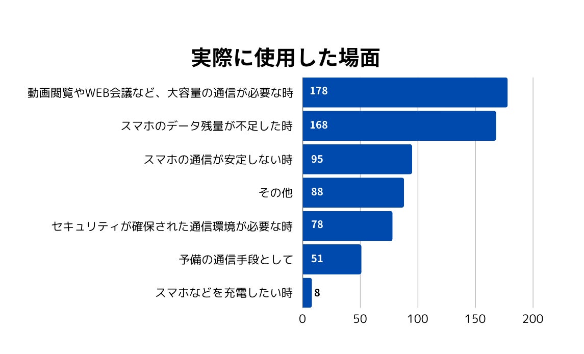 ・利用したシチュエーション別では、1位が「動画閲覧やWEB会議などの大容量通信が必要な場面」、2位が「スマホのデータ残量が不足した」、3位が「スマホが繋がりにくい場面」。