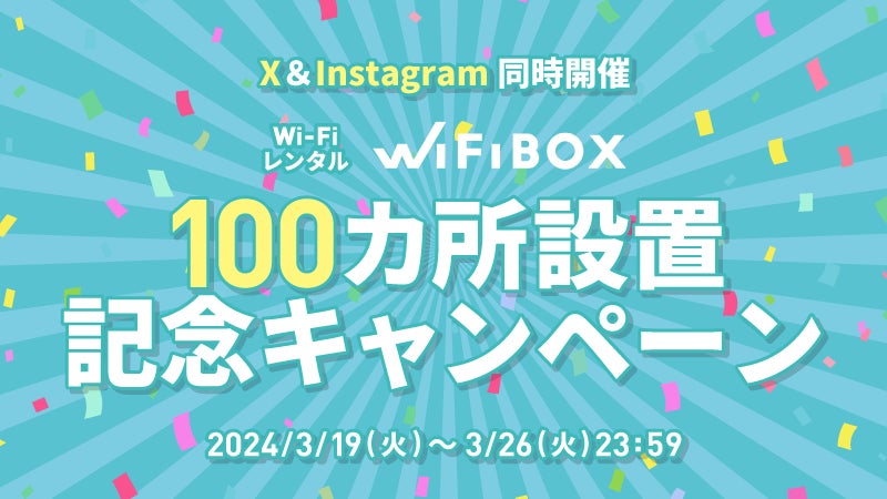 2024年3月19日(火)~3月26日(火)23:59まで、WiFiBOXの設置箇所100カ所達成を記念して、公式X(旧Twitter)および公式Instagramアカウントにて、キャンペーンを実施いたします。