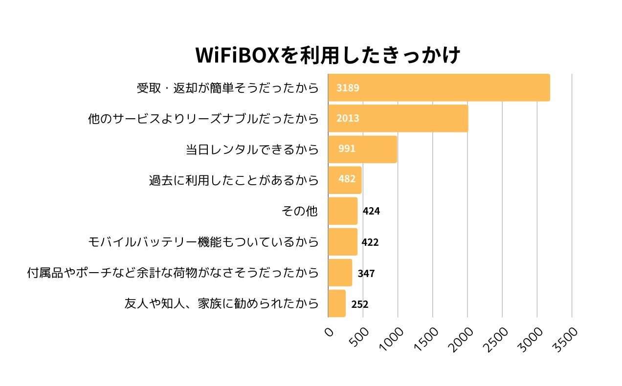 ・WiFiBOXを利用するきっかけとなった点の1位は「受取・返却が簡単そう」2位が「他のサービスよりリーズナブル」3位が「当日レンタルできる」。