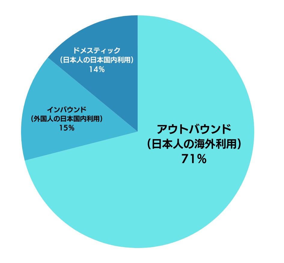 インバウンド・ドメスティックはほぼ同じくらいの利用者数で、合計すると日本国内での利用は約3割という結果となりました。