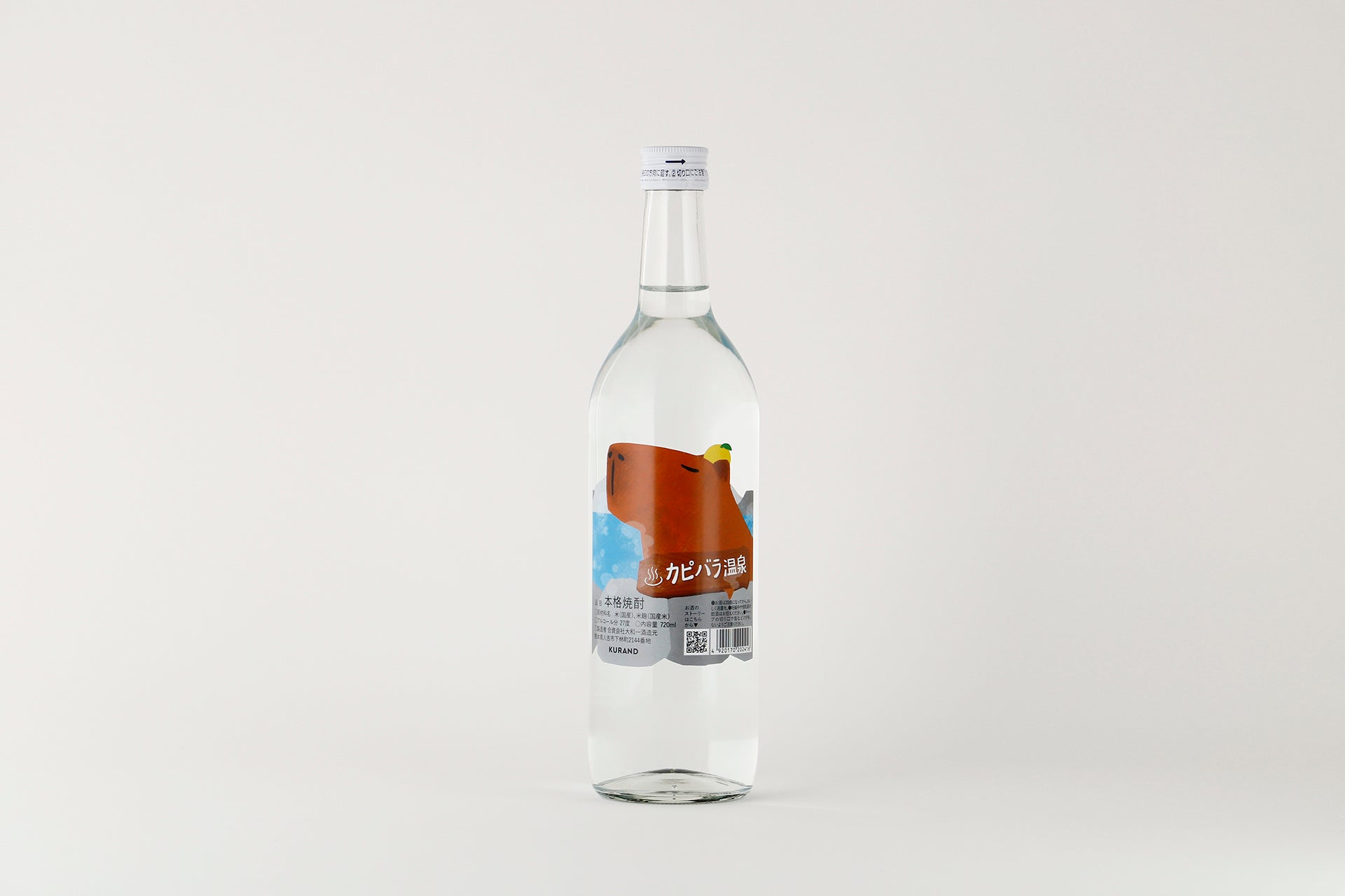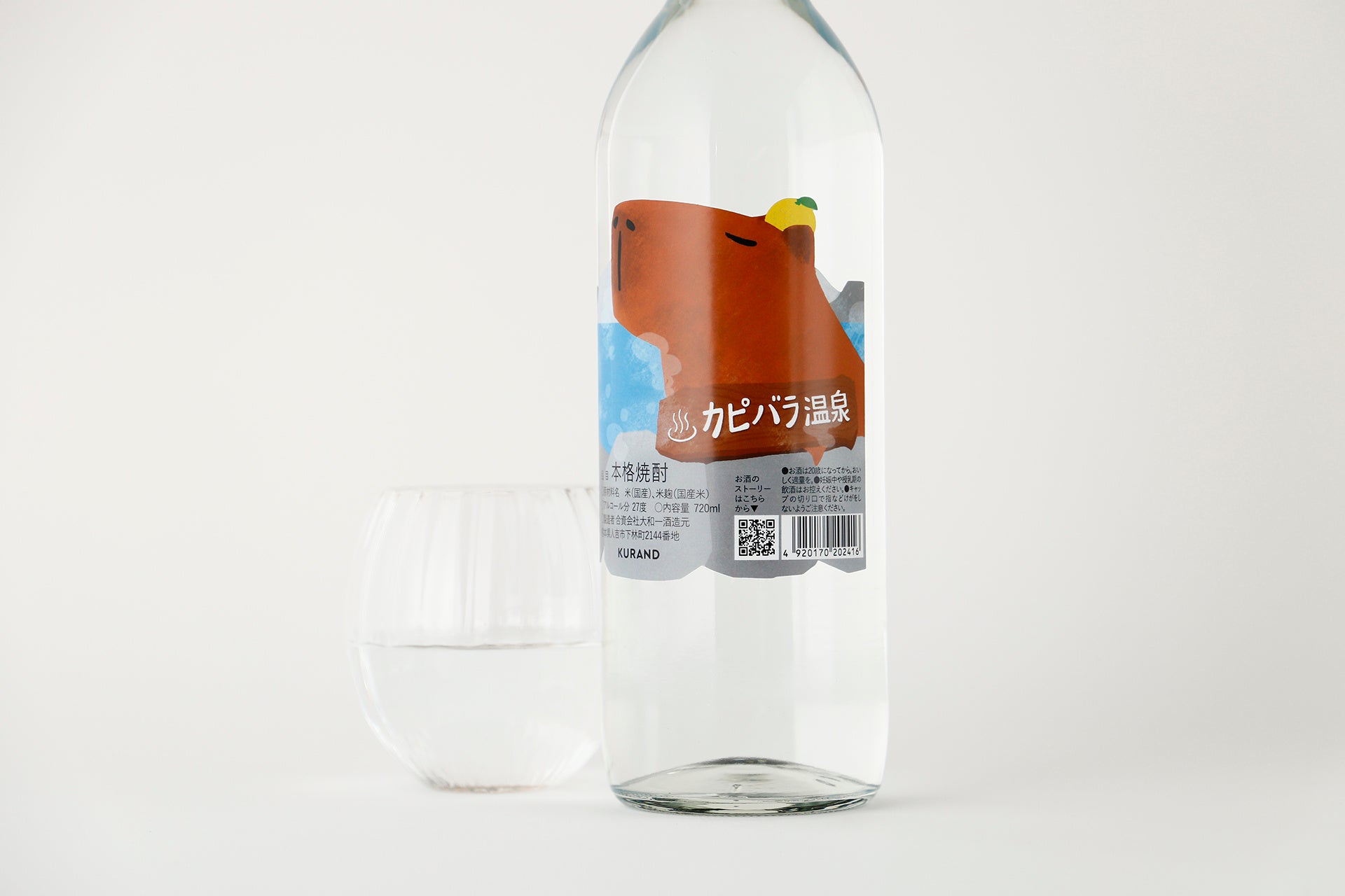 ボトルを覗くと、温泉を優雅に泳ぐカピバラの姿がボトルの中に浮かびます。お酒を飲み進めて瓶内のお酒の量が減ってくると、カピバラは次第に焼酎の温泉にぷかぷかと浸かっているように見えくる姿をお楽しみいただけます。裏ラベルにはうっとりと目を閉じながら、温泉を満喫するカピバラたちが描かれています。