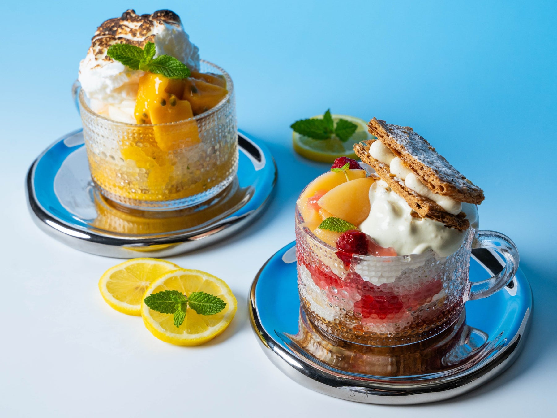 この夏、日本の夏の風物詩である「かき氷」とフランス菓子「アントルメグラッセ(アイスケーキ)」を掛け合わせた、新感覚のかき氷を2種類ご用意しました。自家製のレモンとミントのグラニテをベースに、旬の桃やマンゴーを加え、全体をクリームで包み込みました。ミルフィーユやタルト生地のパリッとした食感がアクセントとなり、一口ごとに異なる食感や風味をお楽しみいただけます。フレンチシェフの発想が光る、THE LIVELY 大阪本町でしか味わえない、この夏限定のハイブリッドスイーツをぜひご堪能ください。