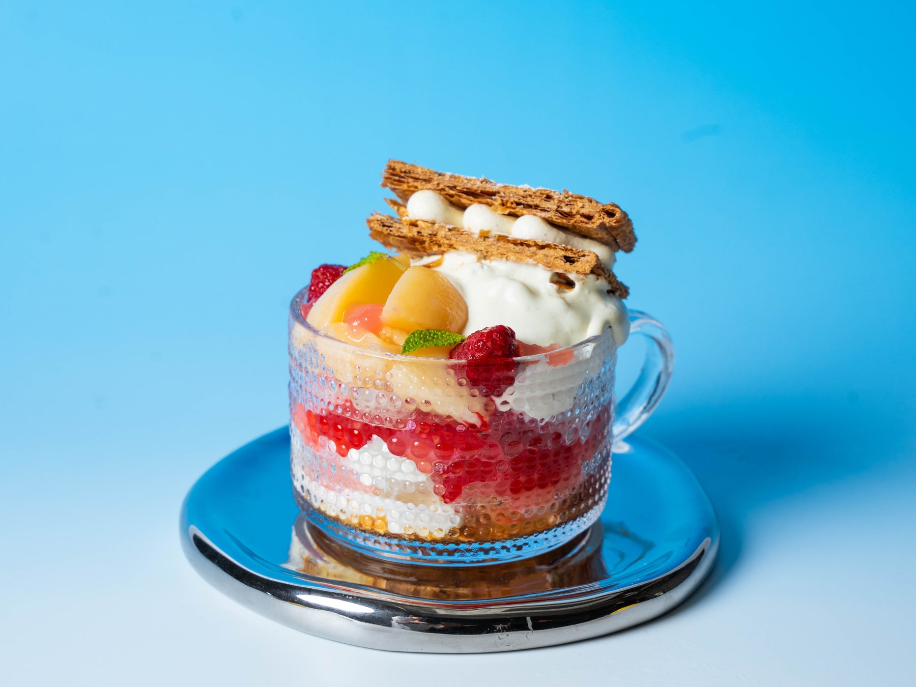 ピーチメルバの桃・フランボワーズ・バニラクリームを基本に、レモンとフレッシュハーブのベルベーヌやミントが効いた爽やかなグラニテに、パイ生地やゼリー、バニラクリームを加えてバランスの取れた味わいに。さらに、ごろっとした桃やパリっと食感が楽しいミルフィーユをトッピングしました。