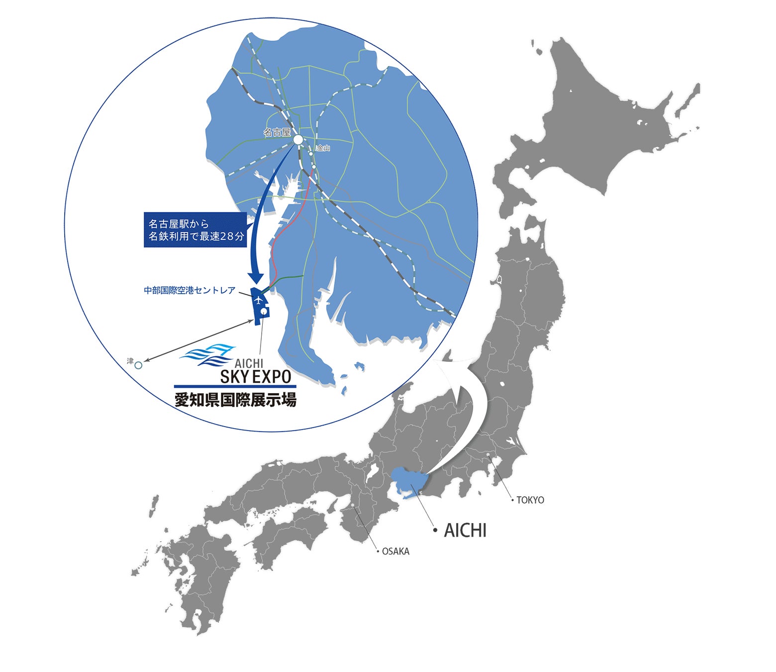 日本初、国際空港直結型の展示場である“Aichi Sky Expo”名古屋駅~最寄駅まで最速28分の位置にあり、2027年名古屋駅はリニア中央新幹線の開業が予定され、東京~名古屋間が40分になるということでアクセス的にも人や技術が集う、大都市圏として期待されています。