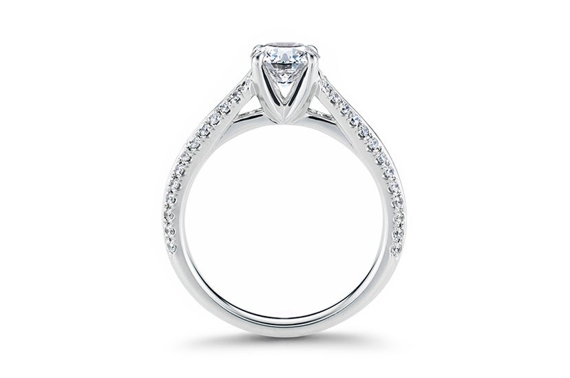 身に着けた瞬間、輝きだけで満たされているように、アームの空間から見えるセンターダイヤモンド下の5石のメレダイヤモンドまでも美しく輝きます。ふんだんにセッティングされた大小様々なメレダイヤモンドが指元を壮麗に彩ります。