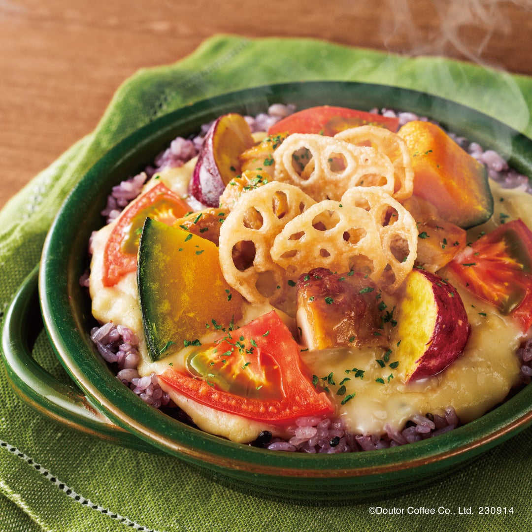「秋の味覚」を楽しむ季節のドリアです。素材の風味を楽しんでいただくために、あえて味付けせずにごろっとしたさつまいもとかぼちゃをトッピング。さらにグリルチキンやトマトも加え、食べ応えと彩りをプラスしました。ホワイトソースに加えた柚子胡椒のピリッとした風味が、全体の味わいをまとめています。仕上げにフライドレンコンチップをトッピングすることで、食感や味の変化も楽しめ、最後までおいしくお召し上がりいただけます。