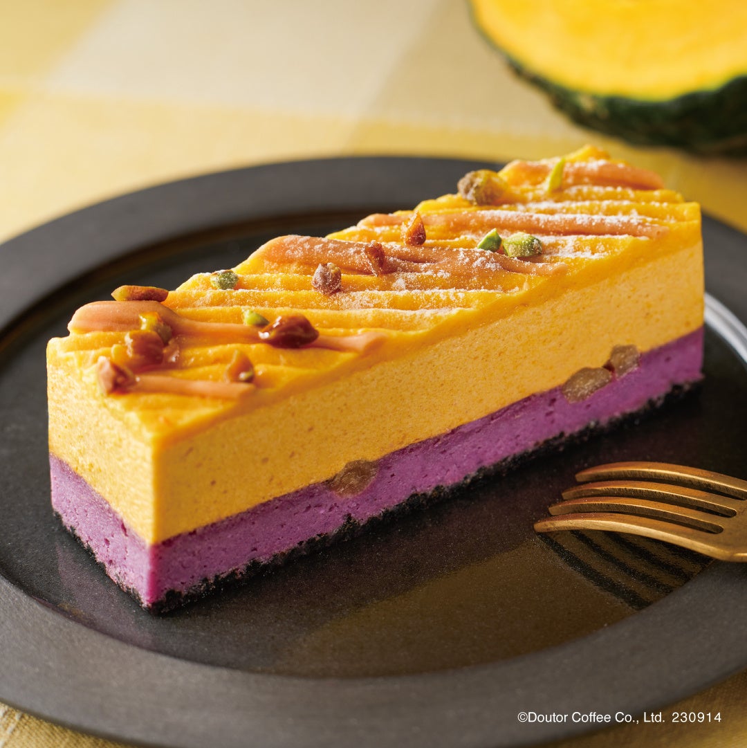 秋の食材かぼちゃと芋を使った、彩り鮮やかなケーキです。ココアクッキー生地に、鹿児島県産紫芋のチーズケーキと北海道産かぼちゃのムースを重ね、天面はかぼちゃのカスタード、キャラメルソースを絞り、ピスタチオをトッピングしました。ムースやチーズケーキのなめらかな食感と、それぞれの食材の鮮やかな色合いをお楽しみいただける一品です。