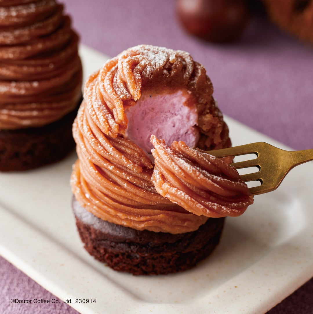 秋の食材の栗を使用し、季節を感じるモンブランに仕上げました。ココア風味の生地の上に、カシス風味のホイップクリームをのせ、イタリア栗のモンブランクリームを絞って仕上げています。カシスクリームの酸味が、イタリア栗のモンブランの甘味をスッキリと感じさせてくれます。