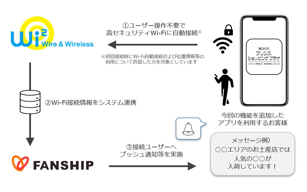 本実証実験は「軽井沢・プリンスショッピングプラザアプリ」(以下「当該アプリ」)を通じ、ご来店いただいたお客さまへ施設内の高セキュリティWi-Fiへの自動接続をご提供することで、施設内にあるアクセスポイントから店舗情報や曜日に応じた施設からの最適な情報を配信するなど、お客さまの利便性や回遊性の向上に向け、新しい顧客体験をご提供いたします。
