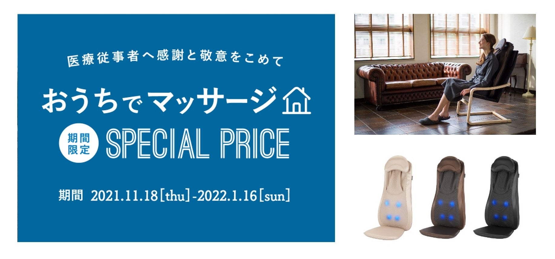 今回、新型コロナウイルス感染症の流行拡大の最前線でご尽力を続ける医療従事者の皆さまに敬意を表すとともに、今後の感染症拡大防止に向けた支援活動として、【おうちでマッサージキャンペーン】を実施し、売上の一部を寄付させていただきました。人々の健康に寄り添う企業として、医療従事者の皆様のお力になれますと幸いです。