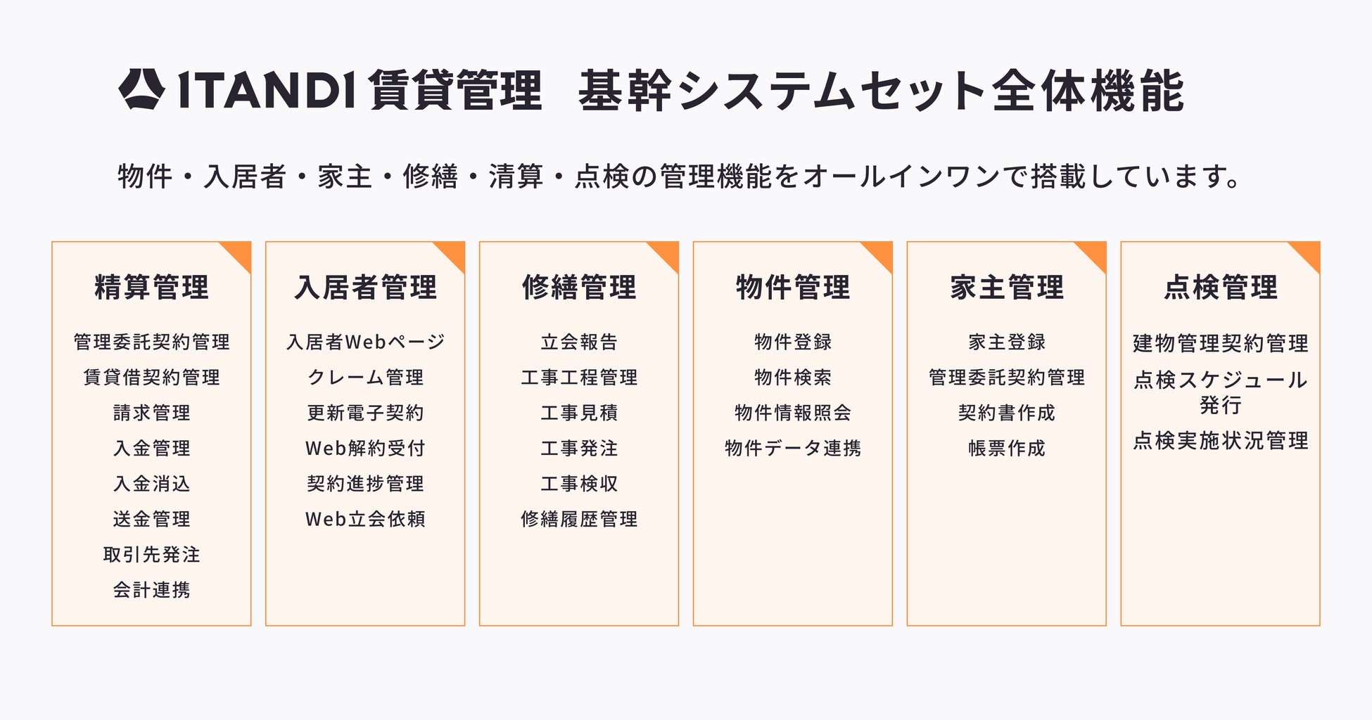 「ITANDI 賃貸管理」 基幹システムセットは、データ分析に基づく収益性と物件オーナーなどの顧客満足度の向上をコンセプトとし、賃貸管理業務における精算・物件・入居者・オーナー・修繕・点検の管理を一括して効率化する賃貸管理システムです。本システムで管理している情報は、全国賃貸⼊居申込の約40%で仲介会社に利⽤(※1)される、リアルタイム不動産業者間サイト「ITANDI BB」に自動で連動されるため、空室状況、賃料、設備情報などを常に最新の状態で仲介会社に届けることが可能です。