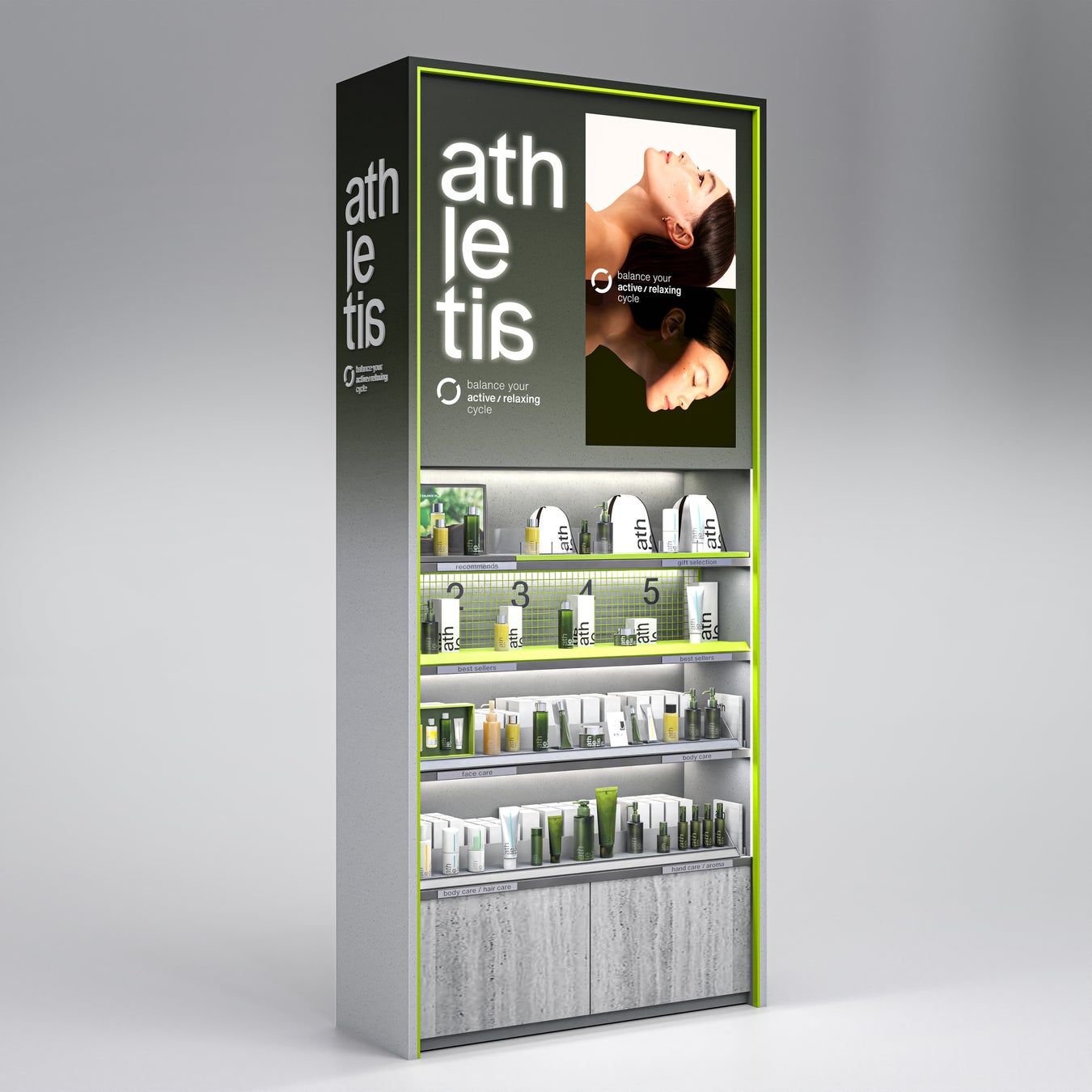 毎日のスキンケアに加えてリラックスシーンとアクティブシーンのそれぞれをサポートし、ライフスタイルに24時間寄り添う製品ラインナップを展開する athletia。「balance your active/relaxing cycle」をコンセプトに掲げ、「よく動き、よく休む」の循環やオンとオフの切り替えに寄り添うことで、お客様それぞれのセルフコンディショニングをサポートできると考えています。また日本発のクリーンビューティブランドとして、自然や環境、社会に配慮したブランド活動を行っています。