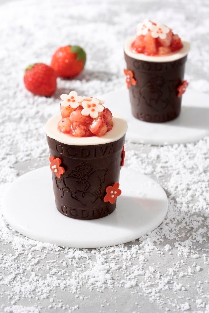新年のお祝いにぴったりな、紅白のデコレーションをあしらったニューイヤー期間限定のクープショコラです。苺を贅沢に使用し、ダークチョコレートカップの中には、スポンジ、ホイップクリーム、角切りにした苺が層になっています。イートインでは、ストロベリーアイスクリームを添えて提供いたします。