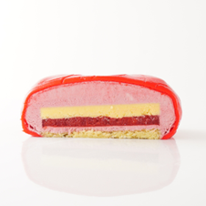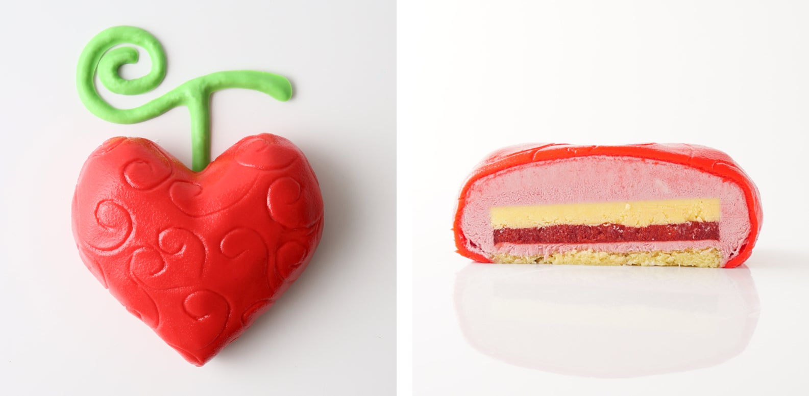 「オペオペの実」を再現したケーキは、ホワイトチョコレートとイチゴのムースの中に、クリームヴリュレと、ラズベリーとイチゴのジュレが口の中で絶妙なコントラストを奏でます。甘さ控えめでさっぱりとした味わいが特徴です。表面をローズ色のチョコレートでコーティングし、果皮の唐草模様を表現することで「オペオペの実」のリアリティさを追求しました。