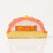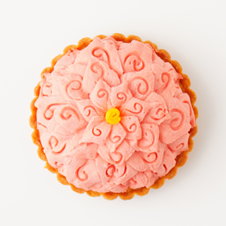 「ハナハナの実」を再現しピンク色に仕上げたタルトは、エシレバターを使用してしっとり焼き上げたタルト台の上に、なめらかな桃のムースを。タルトの中心にある、シロップ漬けを忍ばせたジューシーな桃のジュレがアクセントとなり、味をしっかり引き締めます。外側の「ハナハナの実」の果皮の模様は、桃が香るピンク色のホワイトチョコレートクリームで一枚一枚絞りました。ほんのり甘く香ばしいタルトとなっています。