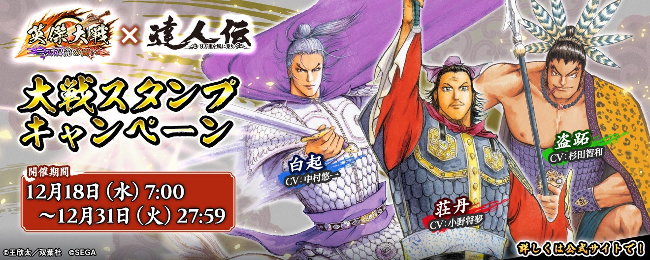 株式会社セガ フェイブ(本社:東京都品川区、代表取締役社長執行役員:杉野行雄)は、現在稼働中のアミューズメント施設向け対戦型カードアクションゲーム『英傑大戦 二天双龍の闘い』(以下、英傑大戦)において、漫画家 王欣太先生とのコラボイベントを、本日2024年12月18日(水)より開始したことをお知らせいたします。