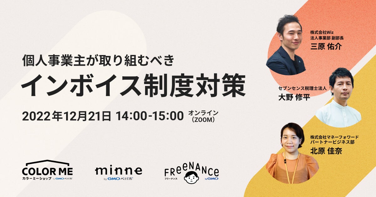 また、個人事業主のユーザーが多い、ネットショップ作成サービス「カラーミーショップ byGMOペパボ」、国内最大(※)のハンドメイドマーケット「minne byGMOペパボ」、フリーランス・個人事業主向けの金融支援サービス「FREENANCE byGMO」と共催し、より多くの個人事業主の方へインボイス制度の周知を行います。