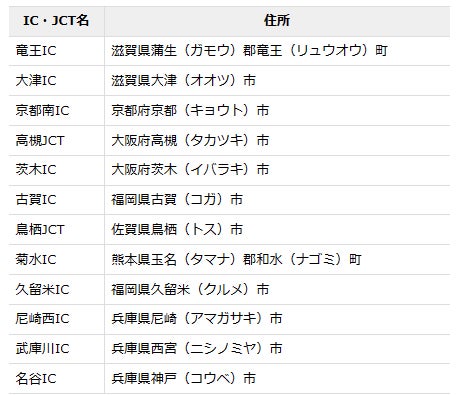 IC:インターチェンジ、JCT:ジャンクション、PA:パーキングエリア、BS:バスストップ